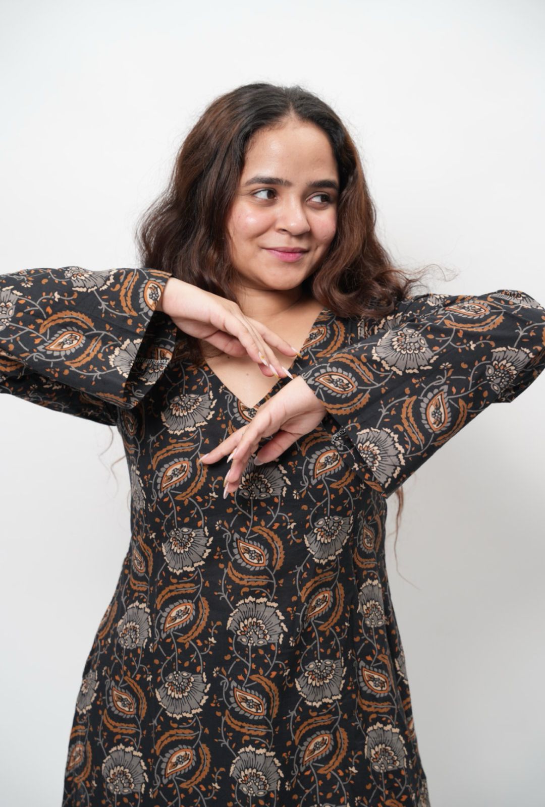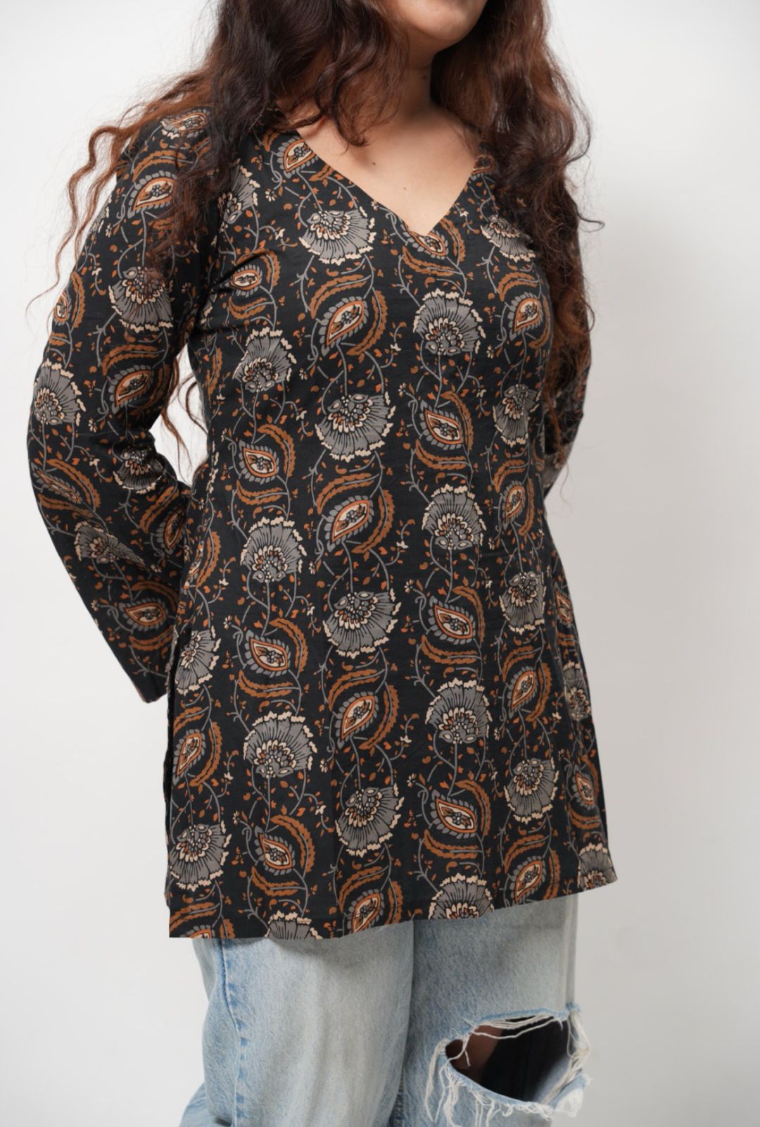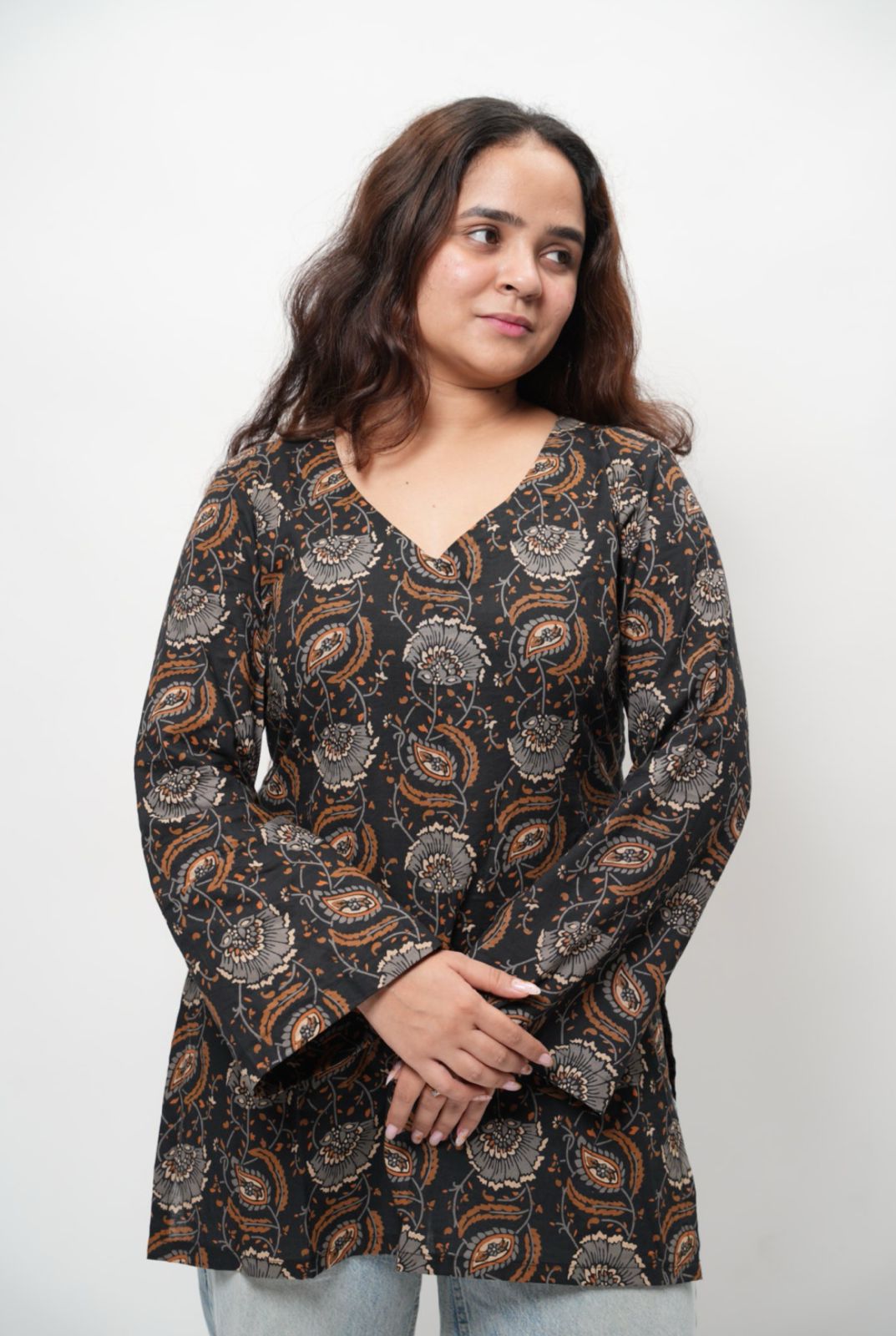 This full-sleeve short kurti features a flattering V-neckline and a clean designer silhouette—perfect for dressing up or down.