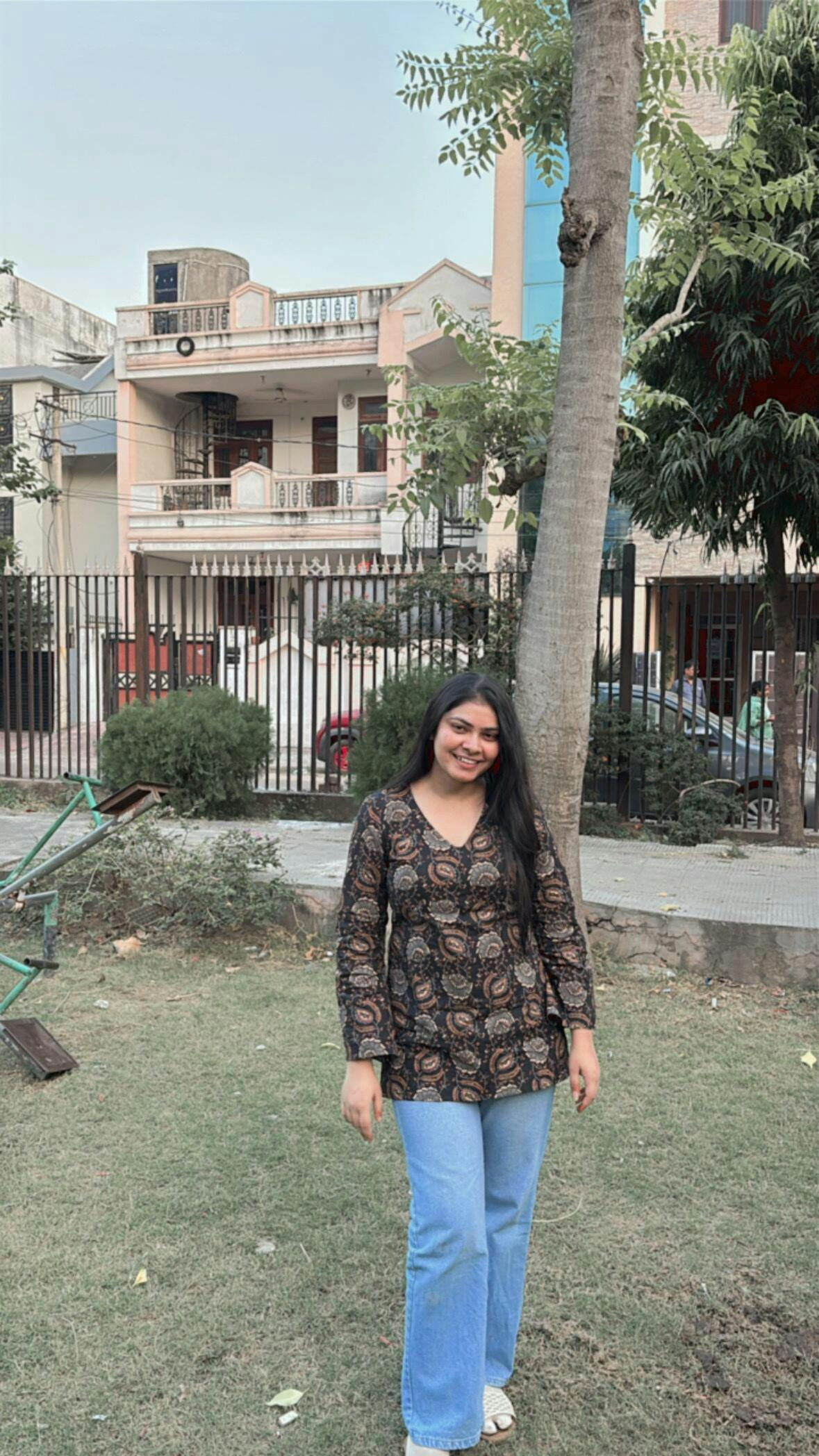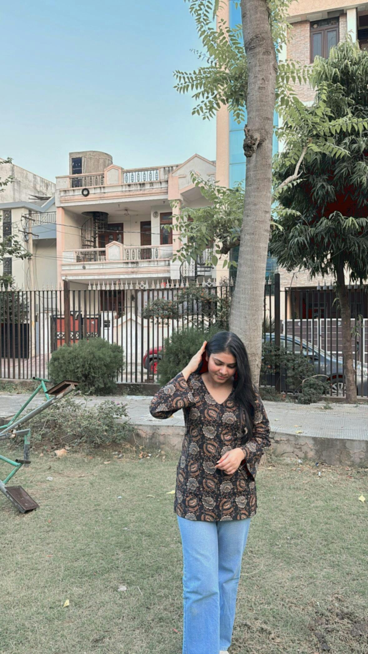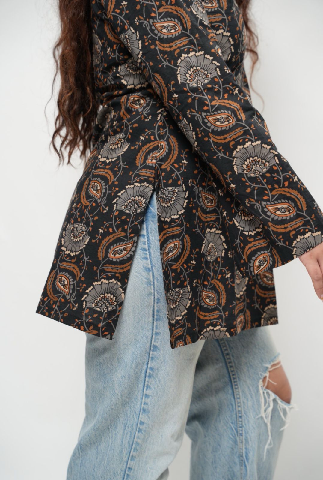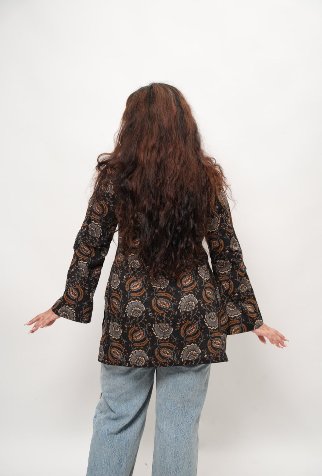 This full-sleeve short kurti features a flattering V-neckline and a clean designer silhouette—perfect for dressing up or down.