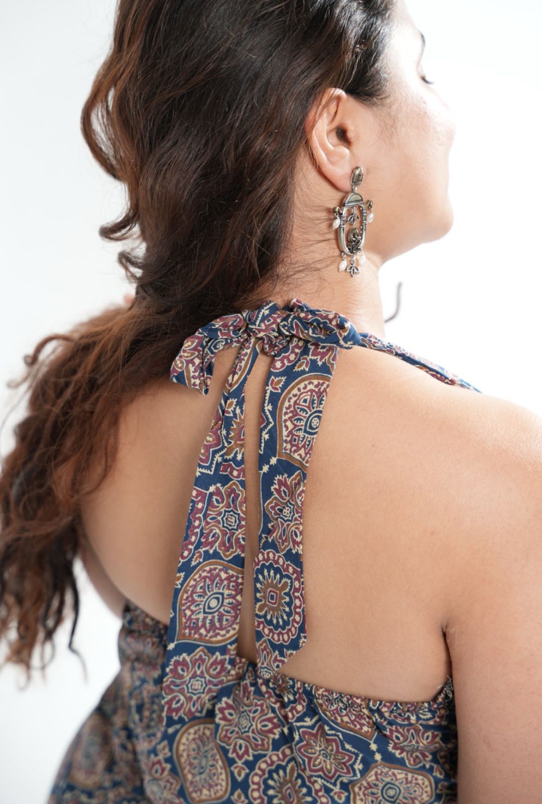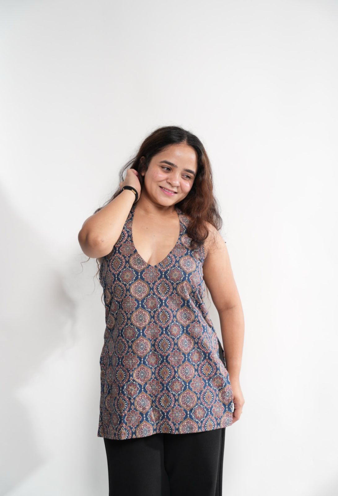 Make a statement in this halter neck, backless short kurti β sleek, stylish, and made to stand out. The rich blue hue adds just the right pop, while the open-back design brings all the drama.