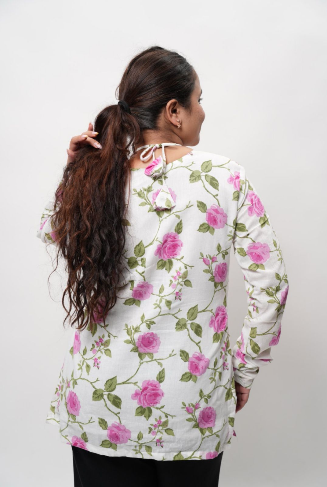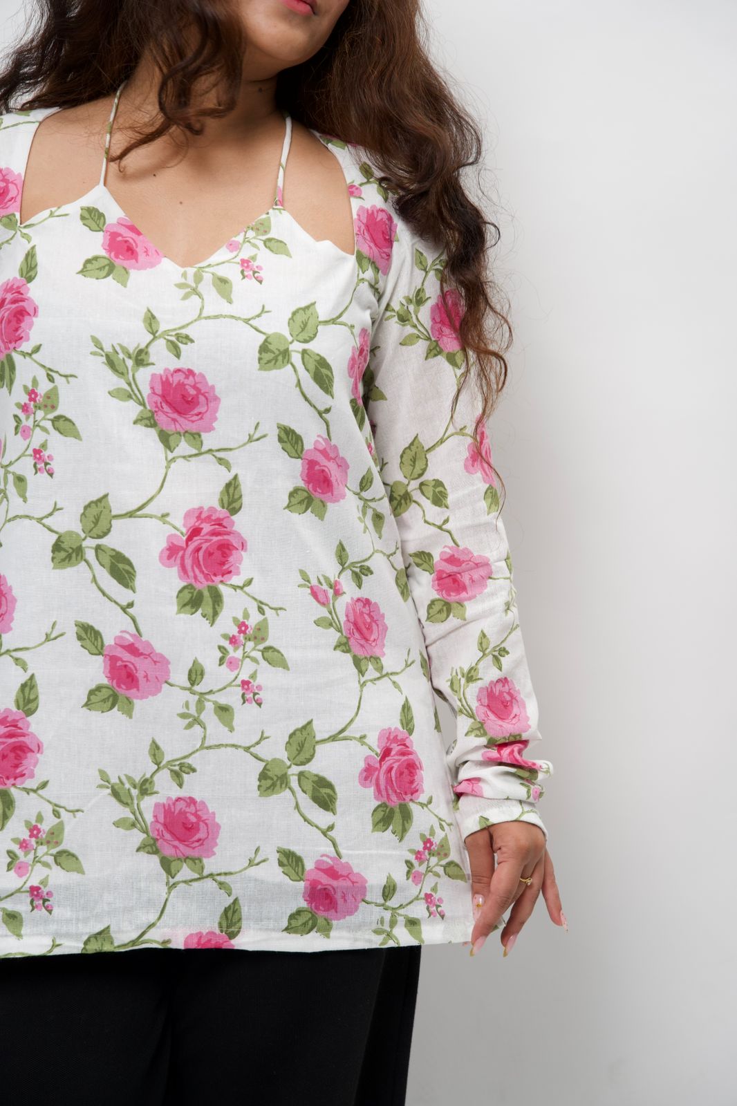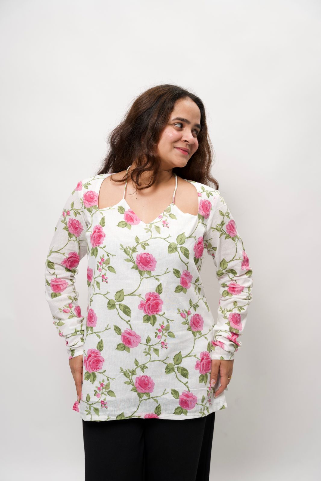 This white and pink floral short kurti features a chic halter neckline and graceful full sleeves ā perfect for brunch dates, daytime events, or just a pretty day out.