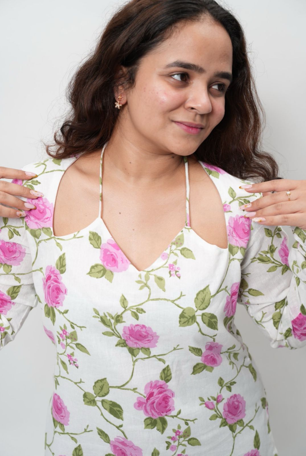 Floral Halter Neck Kurti ā White & Pink Beauty
